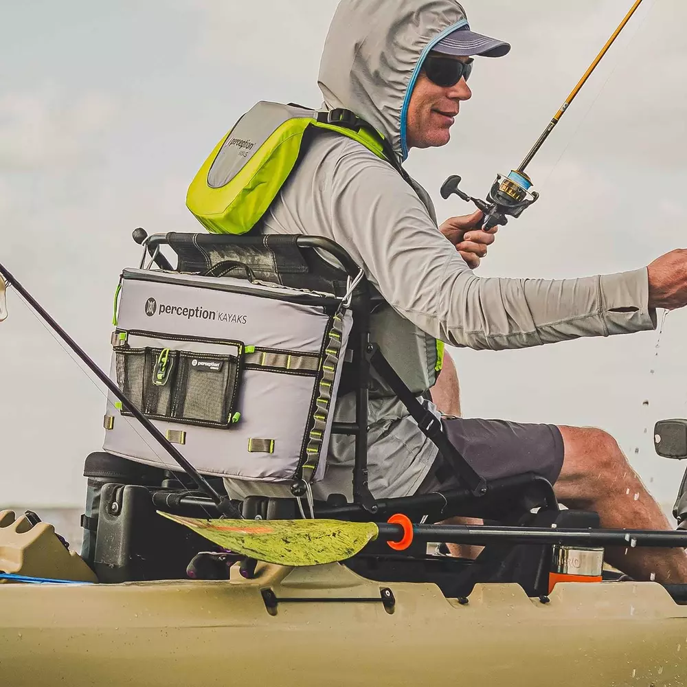 The ultimate slim seatback kayak cooler is here, perfect for keeping drinks and food cold while paddling. This cooler attaches to the back of a lawn chair-style kayak seat via a robust bungee ball system (included). Thanks to its exclusive clip-in system, it is compatible with Perception Splash rod holders and Splash pocket organizers (sold separately). It features waterproof materials, a YKK water-resistant zipper, and RF-welded internal seams, making it durable against splashes and rain. The 3/4” thick closed cell foam keeps drinks and food cold all day long, and the webbing loops and D-rings offer additional lash-down options or can be used to attach extra gear. With a capacity of 12 cans assuming a 1:1 ratio of ice, this kayak cooler also comes with an easy-carry ergonomic grab handle. Please note that it is not intended for submersion or storing fish. Measuring 11.75”H x 18” W x 5” D externally and 11” H x 15.5” W x 4” D internally, this cooler is compatible with Perception Pilot, Pescador Pro 10/12, Crank, Outlaw and other lawn chair-style seating systems.